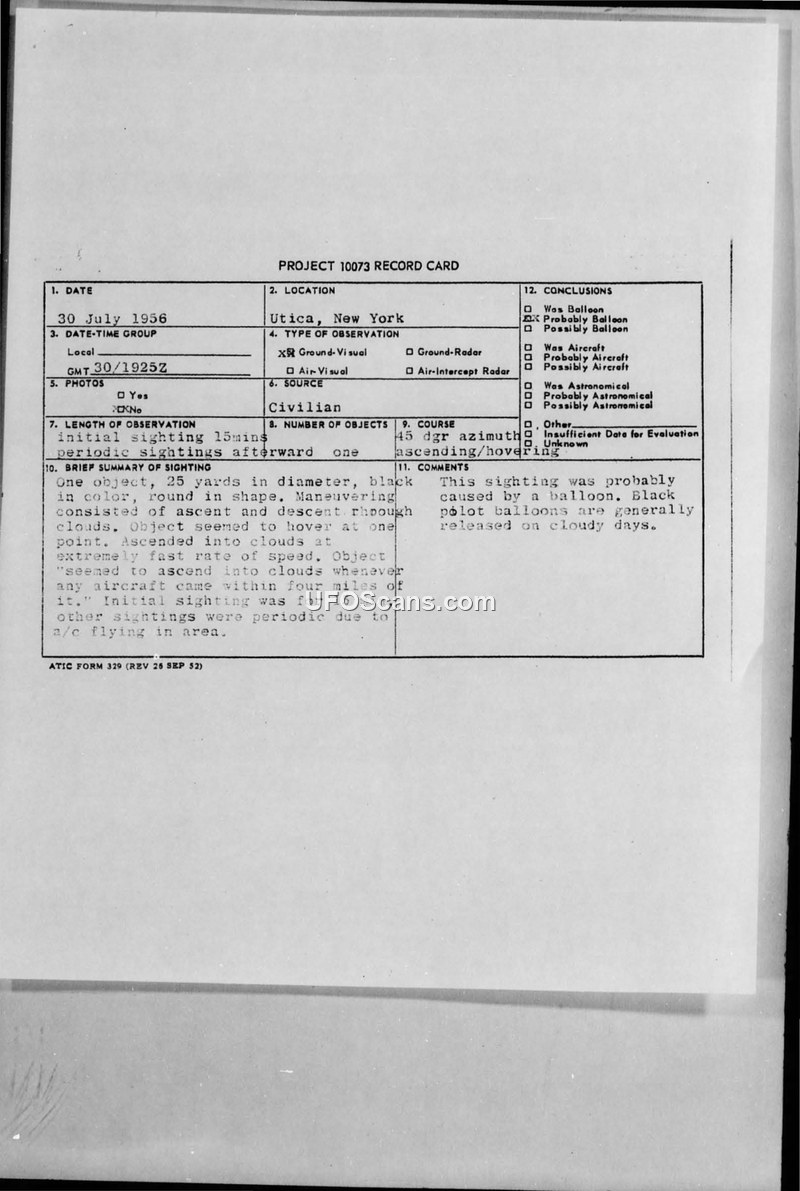 PROJECT 10073 RECORD CARD - Utica, New York - 30 July 1956