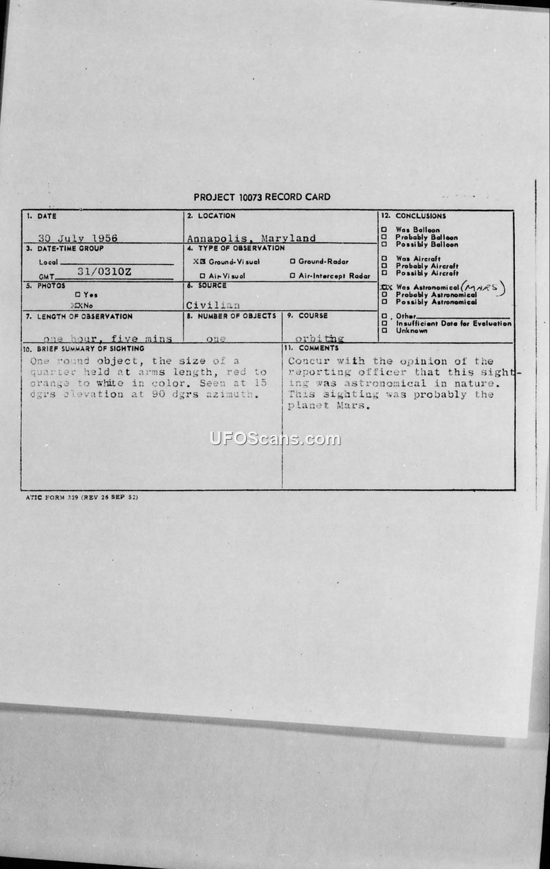 A 1956 sighting report from Annapolis, Maryland, describes a round, color-shifting object observed for over an hour. Military investigators concluded the object was likely the planet Mars.