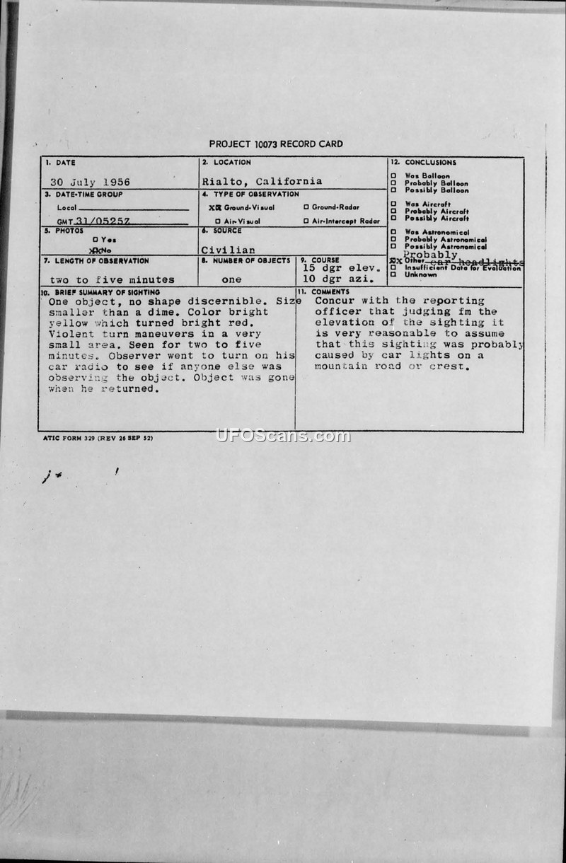 A civilian in Rialto, California, reported a bright, maneuvering object on July 30, 1956. Military investigators concluded the sighting was likely caused by car headlights on a mountain road.