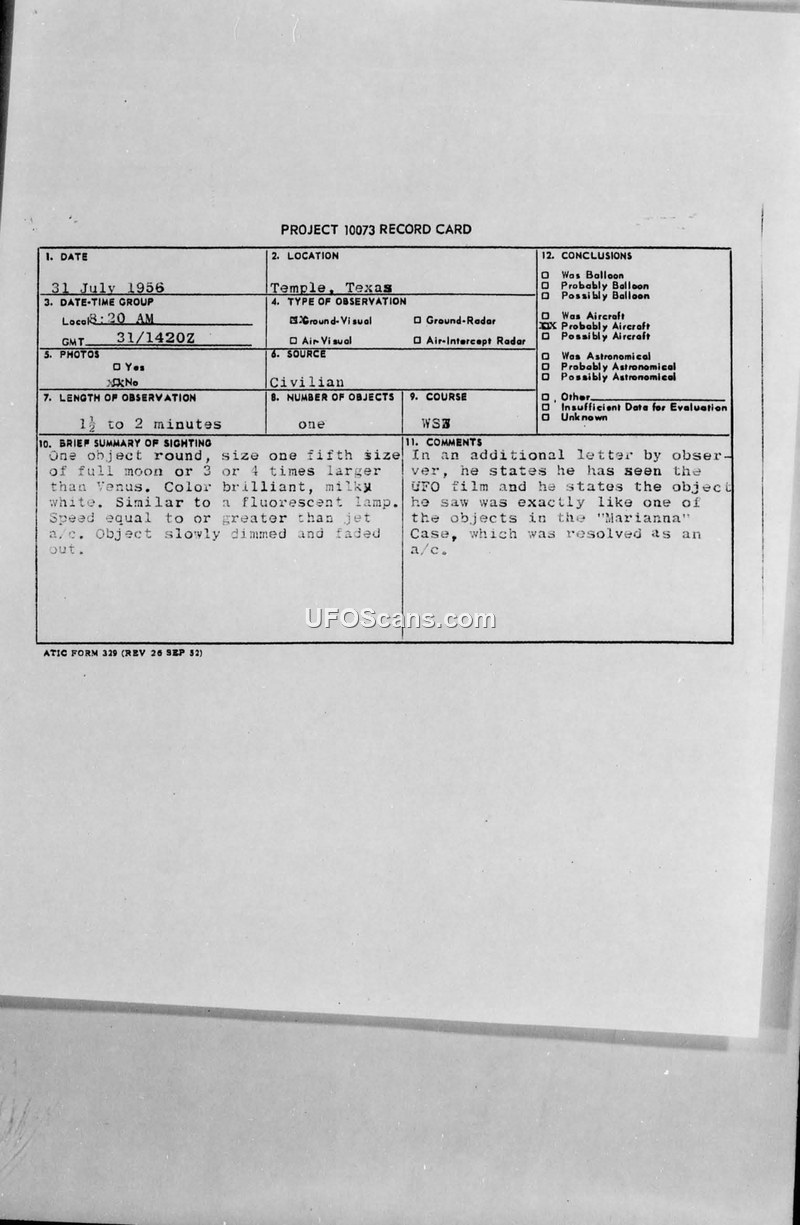 A civilian in Temple, Texas, reported a high-speed, round, white object on July 31, 1956. The Air Force processed the report under Project 10073 and concluded it was 'Probably Aircraft'.