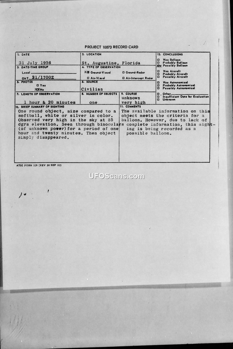 Project 10073 Record Card — St. Augustine, Florida, 31 July 1956