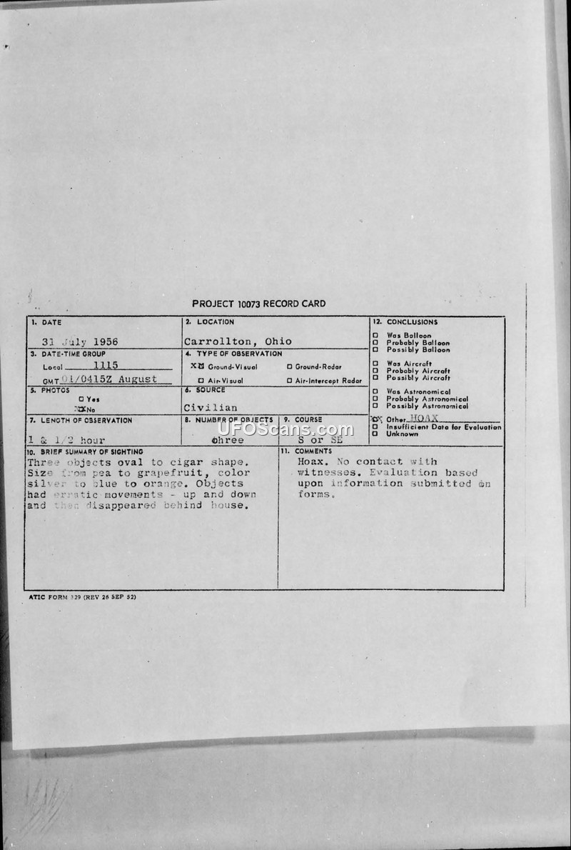 Project 10073 Record Card — Carrollton, Ohio, 31 July 1956