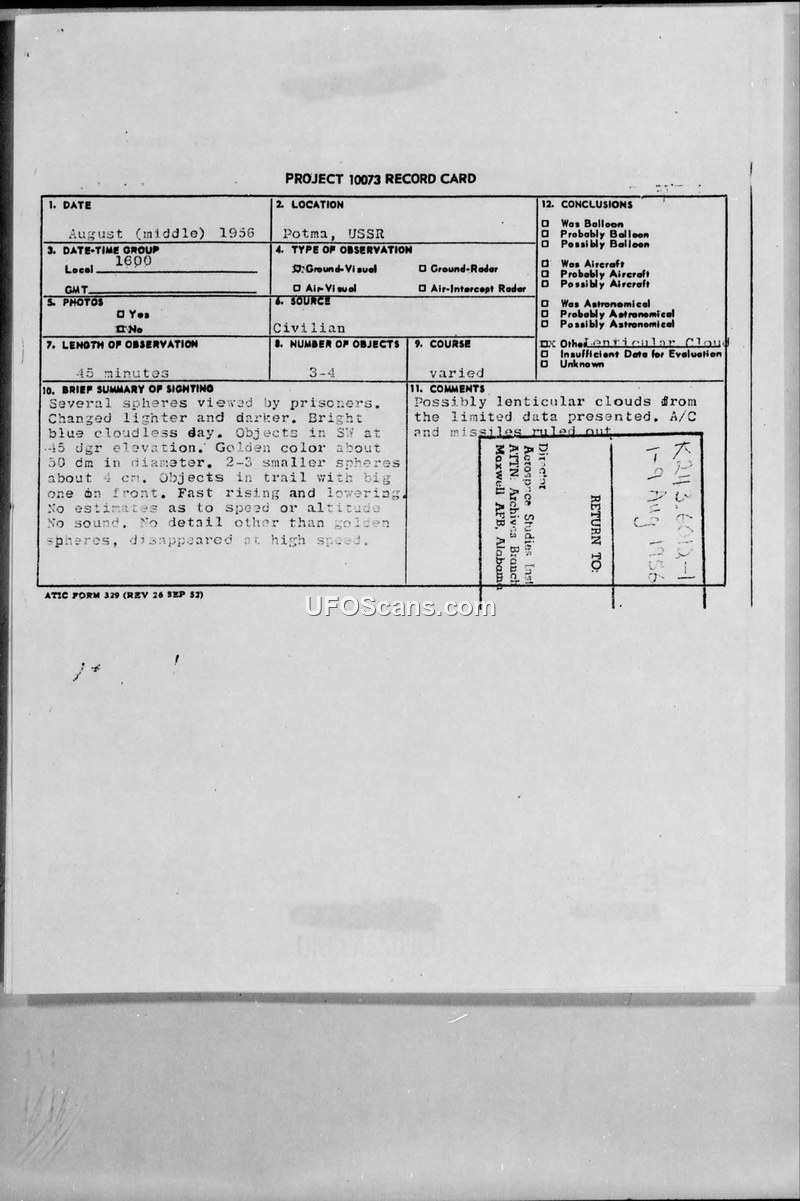 A 1956 sighting of golden spheres by prisoners in the USSR was investigated by US Air Intelligence. The official conclusion was that the objects were likely lenticular clouds, though internal notes suggested they could have been balloons.