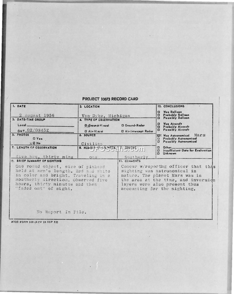 Project 10073 Record Card — Van Dyke, Michigan, 2 August 1956