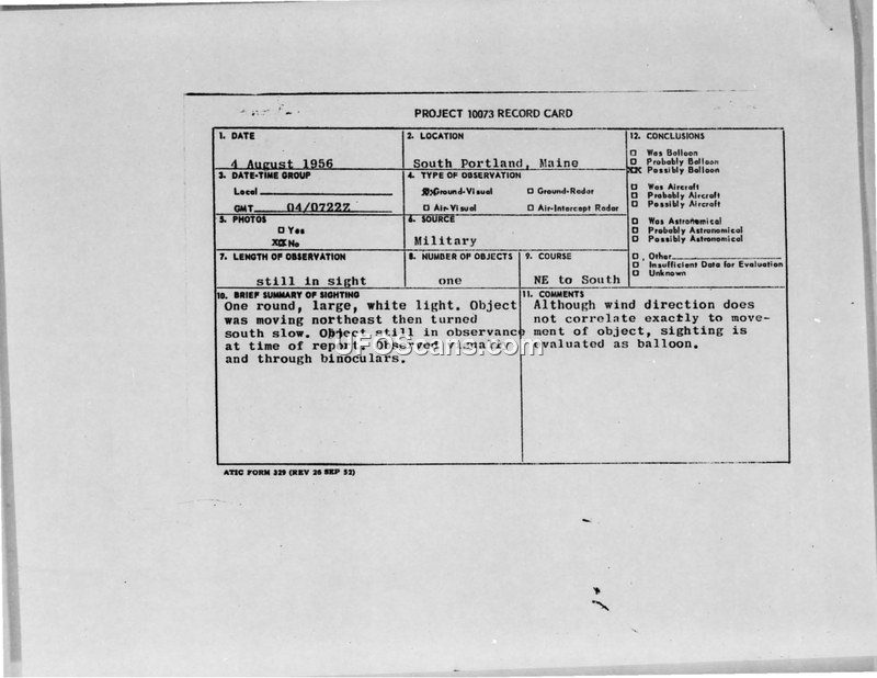 This document contains official military reports of UAP sightings in South Portland, Maine, in August 1956, which were subsequently identified as a balloon and the planet Mars.