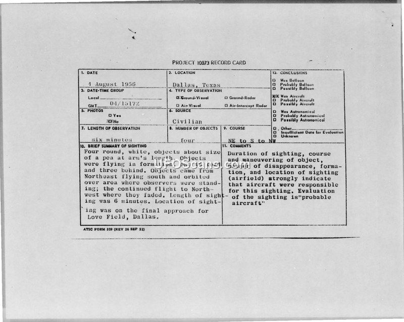 This report documents multiple August 1956 UFO sightings in Dallas, Texas, corroborated by radar data from the 745th ACWRON. The military concluded the objects were likely aircraft, despite initial confusion and issues with processing the associated radar camera film.
