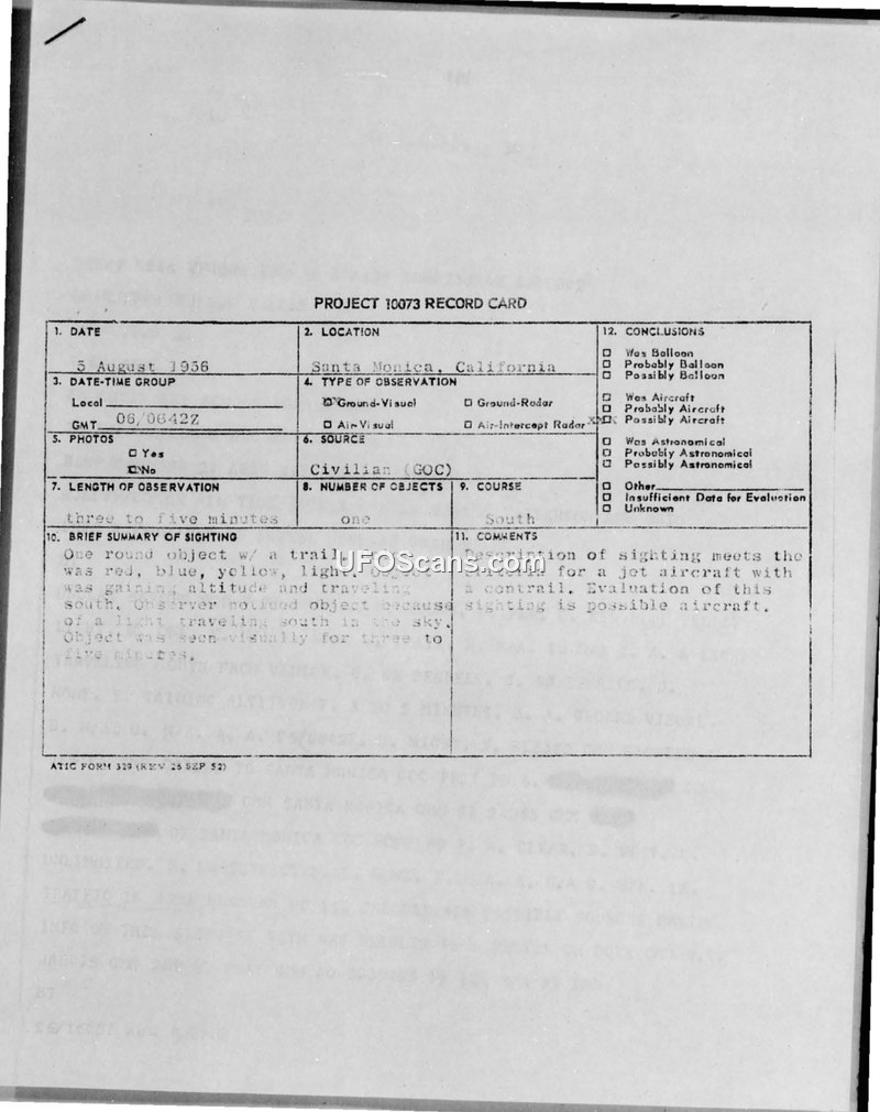 Project 10073 Record Card: Sighting in Santa Monica, California, 5 August 1956