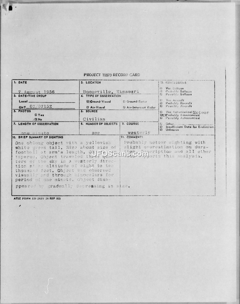 A sighting report from 1956 detailing an observation of an oblong, tapered object with a green tail over Booneville, Missouri. The military investigation concluded the object was an astronomical meteor.