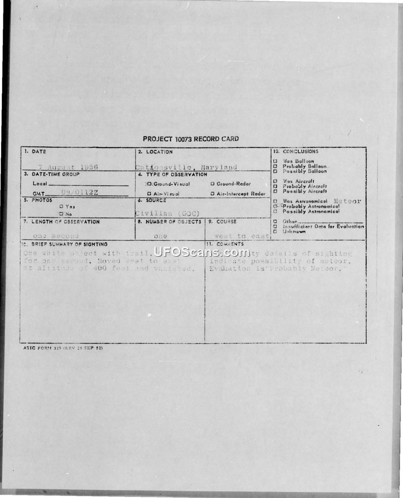 Project 10073 Record Card — Catonsville, Maryland, 7 August 1956