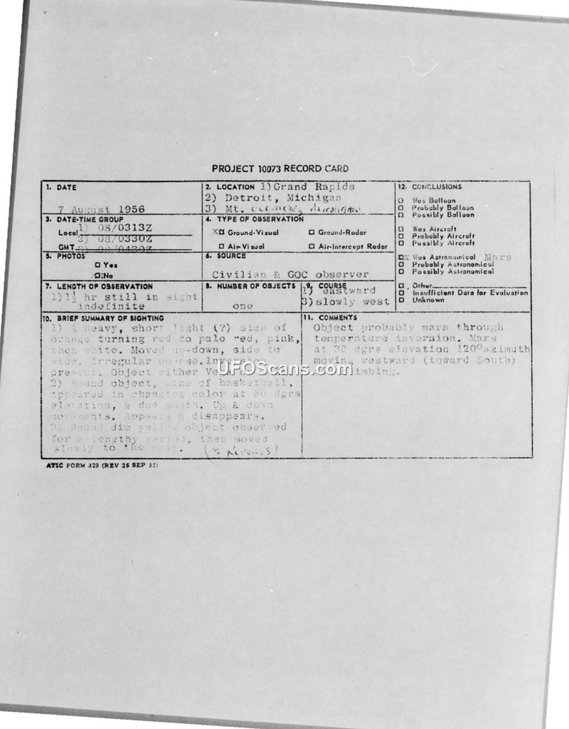 A 1956 sighting report of a round, color-changing object in Michigan was investigated by the USAF. The official conclusion attributed the phenomenon to the planet Mars viewed through a temperature inversion.