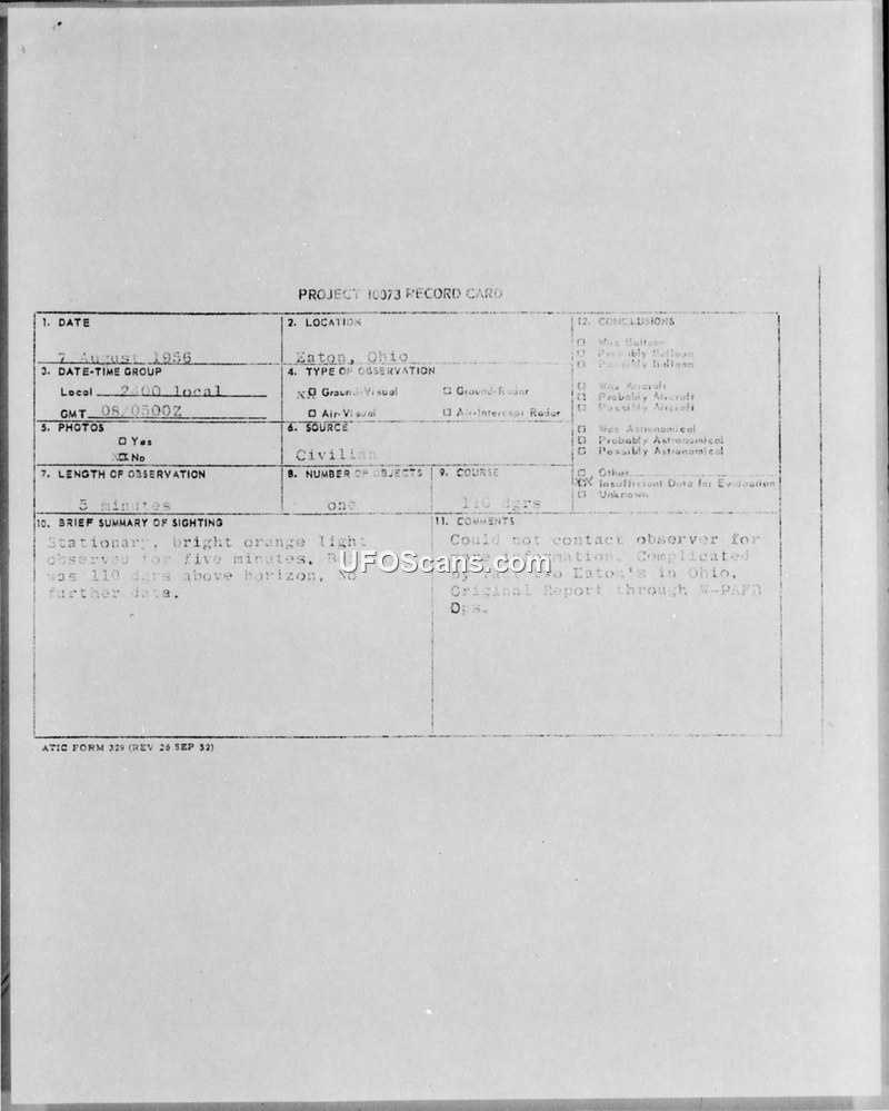 A civilian reported a stationary bright orange light in Eaton, Ohio, on 7 August 1956. The Air Technical Intelligence Center classified the case as having insufficient data for evaluation due to an inability to contact the witness and geographical confusion.