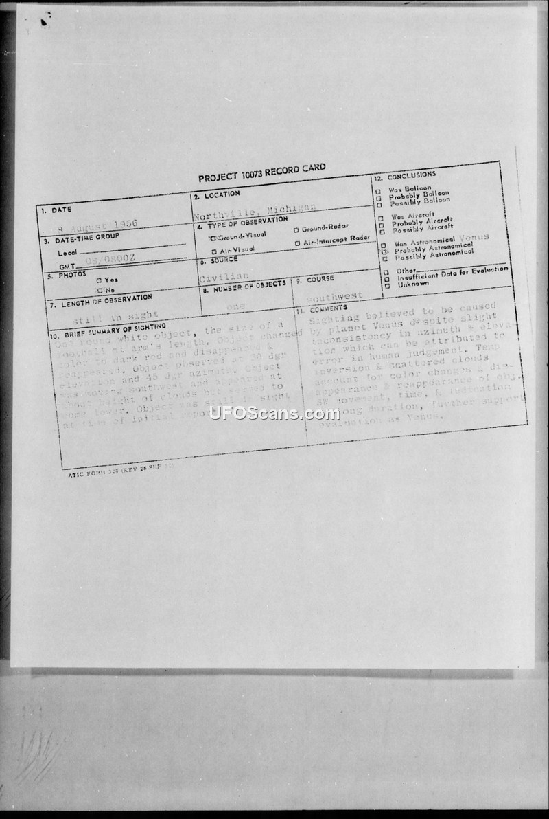 A 1956 UFO sighting report from Northville, Michigan, was officially identified by the Air Technical Intelligence Center as the planet Venus, with visual distortions attributed to atmospheric conditions.