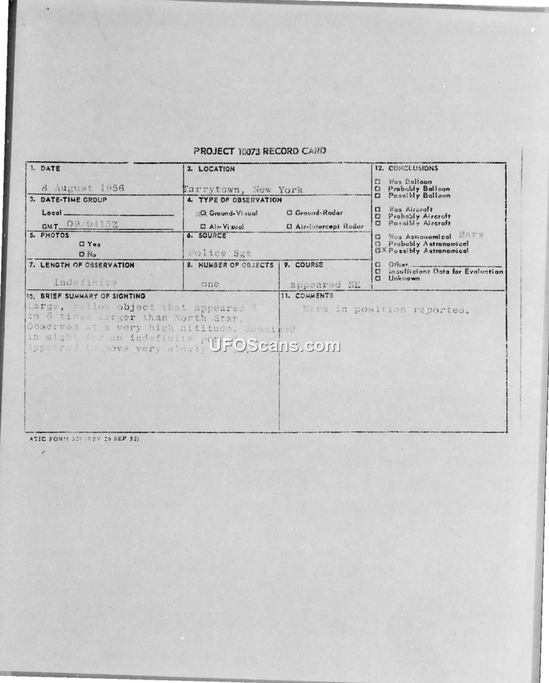 A police sergeant reported a large, yellow object in Tarrytown, New York, on 8 August 1956. Military intelligence evaluated the report and concluded the object was the planet Mars.