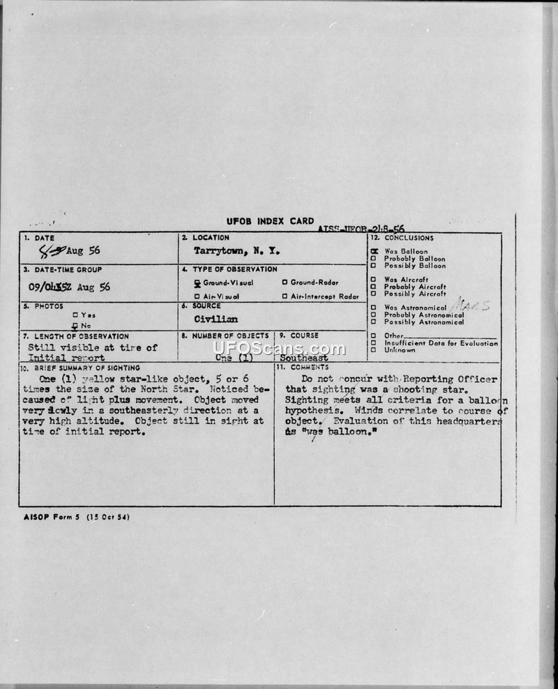 UFOB Index Card and Case Summary — Tarrytown, New York, August 1956