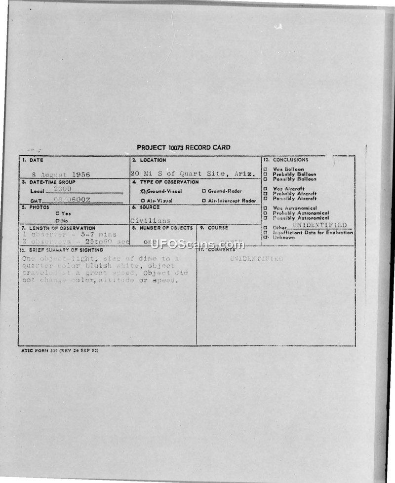 Report of Unidentified Flying Object Sighted on 8 August 1956 in General Vicinity of Quartsite, Arizona