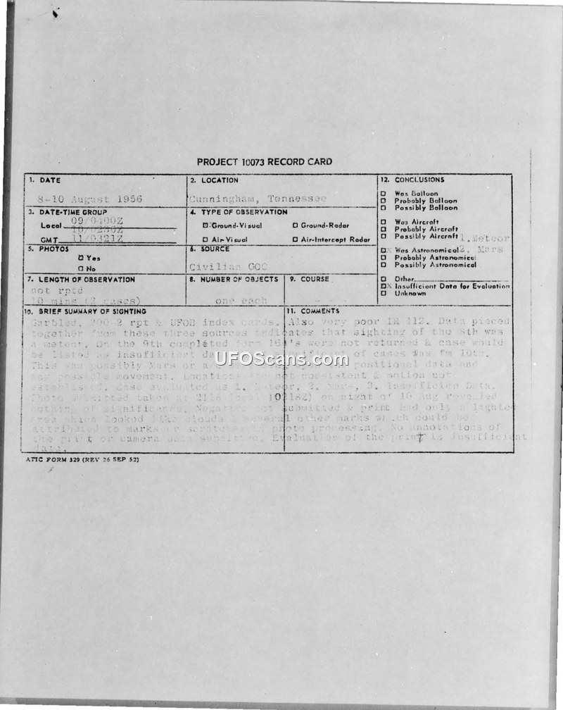 Project 10073 Record Card and Air Intelligence Information Report — Cunningham, Tennessee, August 1956