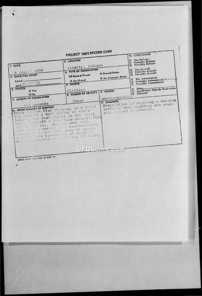 Project 10073 Record Card — Liberty, Indiana, 9 August 1956