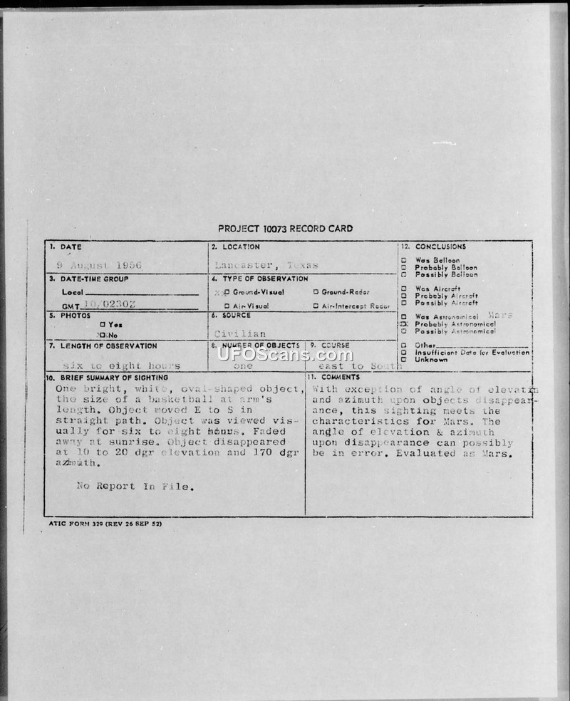 This document is a Project 10073 record card detailing a sighting that occurred on August 9, 1956, in Lancaster, Texas. The witness reported observing a single, bright, white, oval-shaped object, described as being the size of a basketball at arm's length. The object was observed moving in a straight path from the East to the South for a duration of six to eight hours, eventually fading away at sunrise. The object was reported to be at an elevation of 10 to 20 degrees and an azimuth of 170 degrees. The record indicates that no photographs were taken and there was no radar contact. The official evaluation of the sighting concluded that the object was the planet Mars. The investigator noted that while the reported angle of elevation and azimuth at the time of the object's disappearance were potentially in error, the overall characteristics of the sighting were consistent with the planet Mars. The document also notes that there was no report on file.