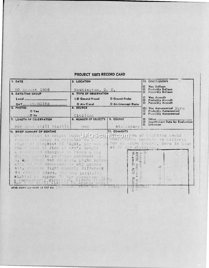 Project 10073 Record Card — Washington, D.C., 10 August 1956