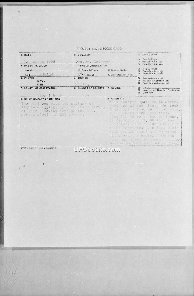 PROJECT 10073 RECORD CARD — Denver, Colorado, 12 August 1956
