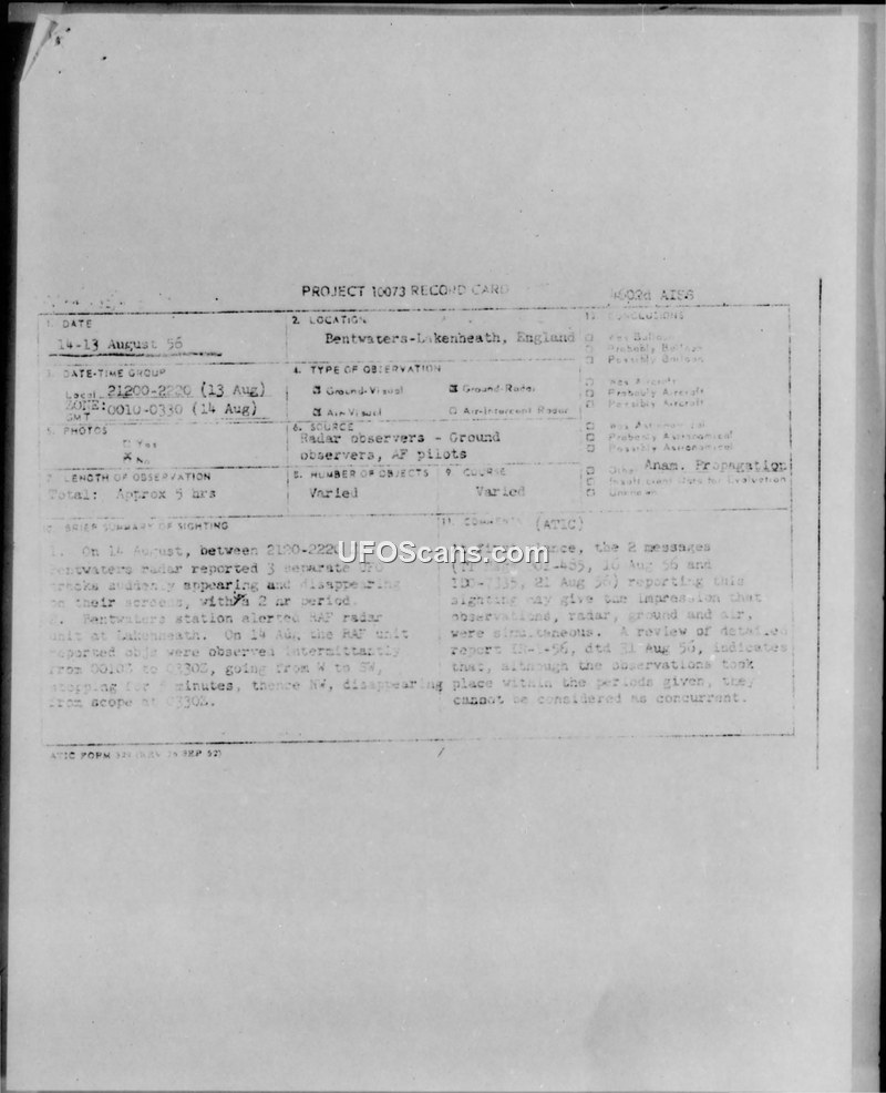 Project 10073 Record Card: Bentwaters-Lakenheath Sighting, 13-14 August 1956