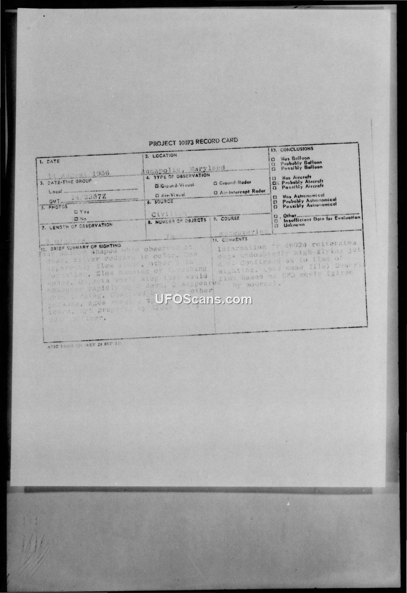 A group of eight witnesses in Annapolis reported four saucer-shaped objects on August 14, 1956. Military investigation concluded the objects were likely high-flying jet aircraft reflecting the sun.