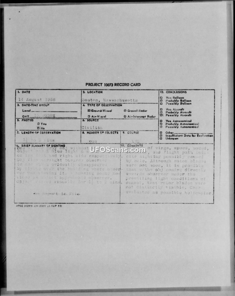 A 1956 sighting report from Boston describes a wingless, silver object with red and blue lights. The Air Force concluded the object was likely a helicopter, with rotor blades obscured by sunset lighting.