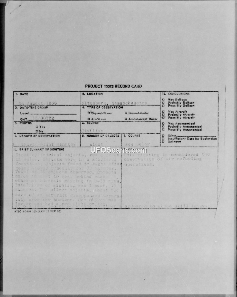 A 1956 sighting report from Fitchburg, Massachusetts, describes eight cylindrical objects in a staggered formation. The official military conclusion identified the event as air refueling operations.