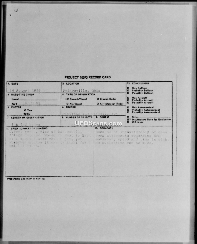 Project 10073 Record Card — Painesville, Ohio, 14 August 1956