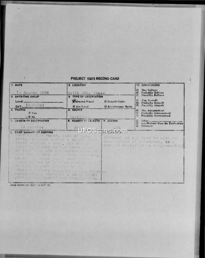 On 14 August 1956, three witnesses at Kelly AFB observed four white, round objects performing complex aerial maneuvers for 15 minutes. The Air Force investigation concluded the cause of the sighting was unknown.