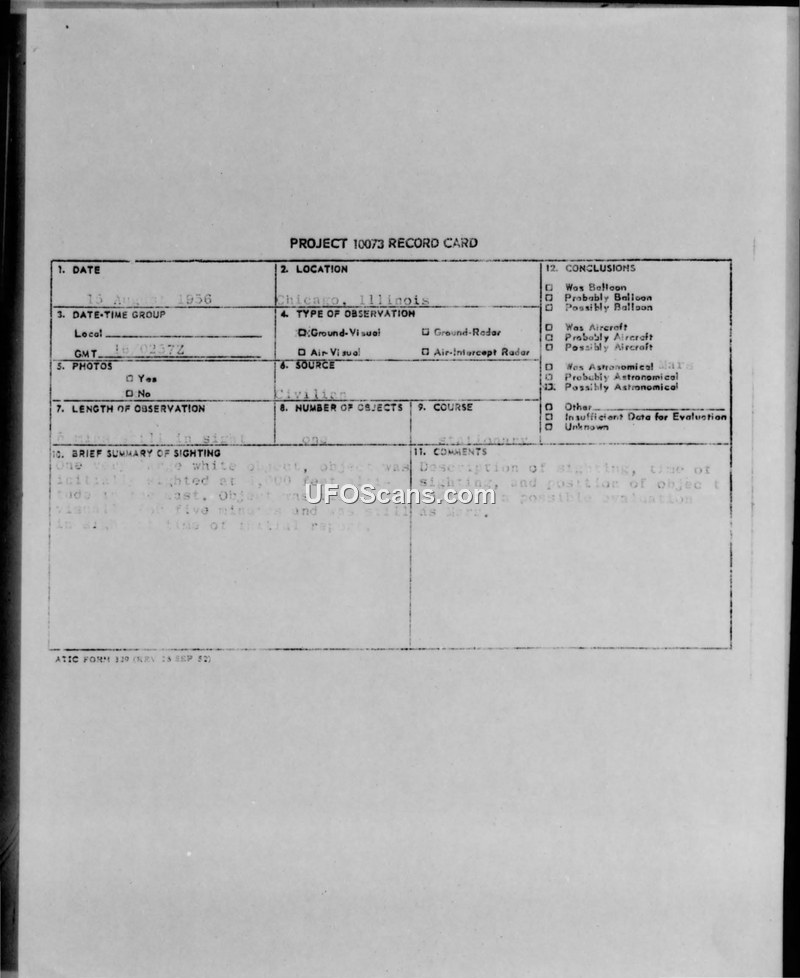 Project 10073 Record Card — Sighting Report, Chicago, Illinois, 16 August 1956