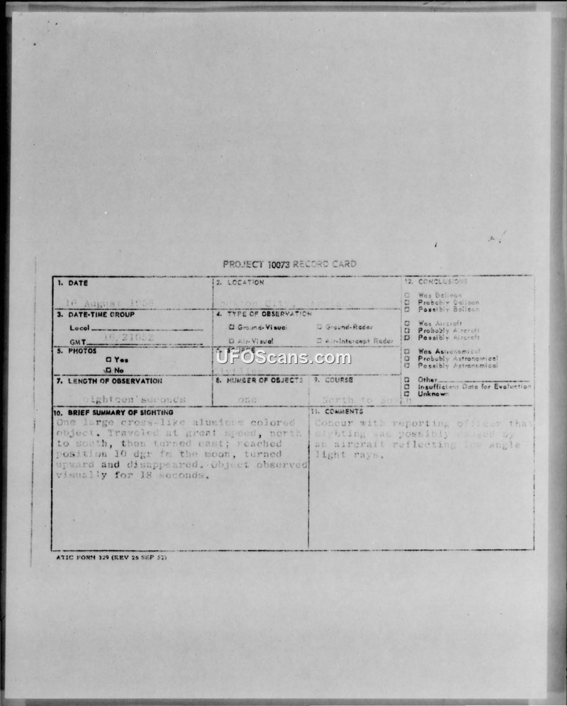 This document consists of a Project 10073 record card and associated teletype communications regarding an Unidentified Aerial Phenomena (UAP) sighting that occurred on August 16, 1956, at 2105Z. The witness, an employee of the Carnegie Institution, reported observing a single, large, aluminum-colored, cross-like object while playing ball with his son. According to the report, the object traveled at a great speed from north to south before turning east. It reached a position 10 degrees from the moon, at which point it turned upward and disappeared. The total duration of the sighting was 18 seconds. The witness reported that the object made no sound and left no exhaust or trail. The official evaluation, provided by the Duty Officer at the Directorate of Intelligence, HQ USAF, concluded that the sighting was likely caused by an aircraft reflecting low-angle light rays. The report notes that a flight of jets was sighted immediately afterwards, which may have contributed to the observation. The documentation includes a record card summarizing the event and a teletype message sent to the Air Defense Command (ADC) at Ent Air Force Base, Colorado, confirming the report details.