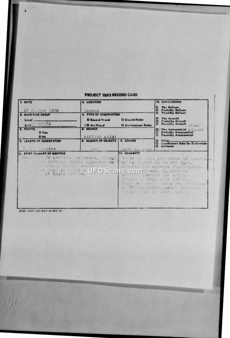 This document contains records and correspondence related to a UFO sighting reported on 17 August 1956 by the pilot of Eastern Airlines Flight 49. The pilot, flying a DC-4 at 6,000 feet, observed a round, orange and white bobbing light for approximately 20 to 25 minutes. The object was reported to be moving west to east and was also sighted by a tower operator at LaGuardia Airport. The sighting occurred at coordinates 31 degrees 50 minutes North, 73 degrees 55 minutes West. Following the report, the Air Technical Intelligence Center (ATIC) initiated an investigation under Project 10073. As part of this process, ATIC sent inquiries to General Mills, Inc., and the 110th Air Support Group to determine if any high-altitude balloons were launched or tracked in the vicinity of the sighting that could account for the object. General Mills responded that there was no possibility that their balloons were in the area. Despite the lack of a confirmed balloon, the official conclusion noted on the Project 10073 record card suggests that the most probable explanation for the sighting was an 'astro body,' although the initial comments on the card also noted that the description appeared characteristic of a balloon. The documentation includes the original record card, various teletype messages confirming the sighting details, and the subsequent administrative correspondence between military units and private contractors.
