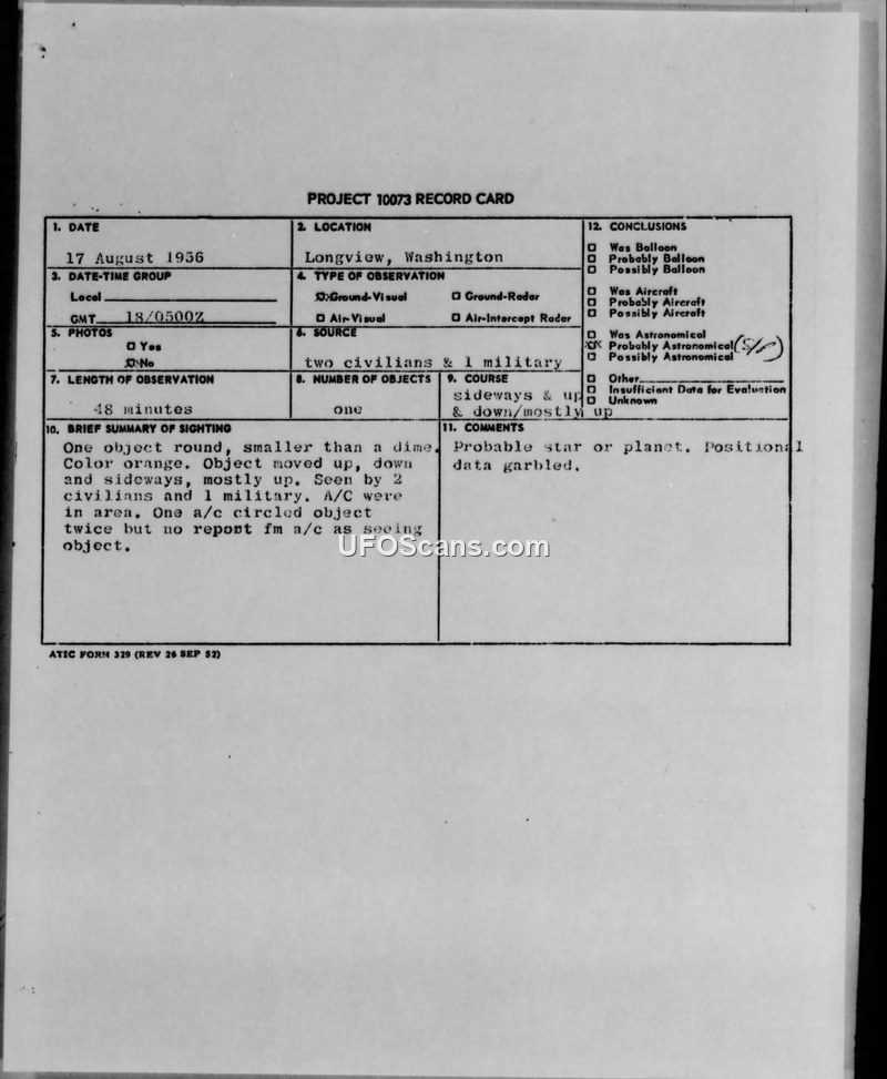 On 17 August 1956, at 0500Z, a sighting of an unidentified aerial object occurred in Longview, Washington. The event was observed by two civilians and one military individual over a duration of 48 minutes. The object was described as round, orange in color, and smaller than a dime. Its movement was characterized as moving up, down, and sideways, with a primary tendency to move upward. During the observation, an aircraft in the area approached the object from the south, circled it twice, and then proceeded back south. The observer reported this interaction, though subsequent checks with the aircraft in the area yielded no confirmation of the crew seeing the object. There was other air traffic passing south-bound on Amber One. The official conclusion reached by the Air Technical Intelligence Center (ATIC) was that the object was a probable star or planet, noting that the positional data provided was garbled. The report includes various teletype communications between the 25th Air Division at McChord AFB, the Air Defense Command at Ent AFB, and ATIC at Wright-Patterson AFB, documenting the incident and the subsequent investigation. The weather conditions were reported as clear.