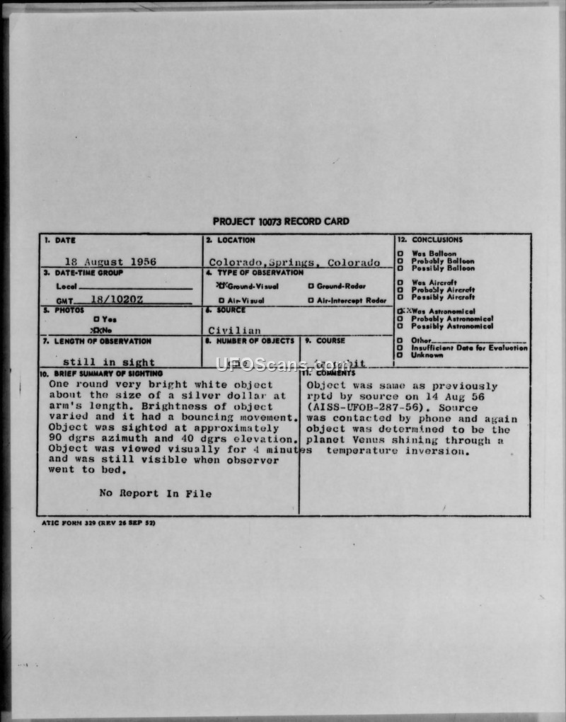 Project 10073 Record Card — 18 August 1956, Colorado Springs, Colorado