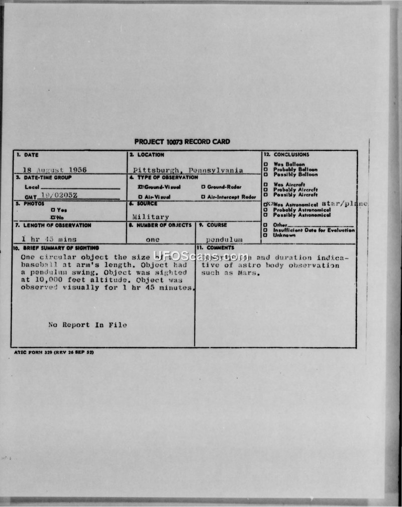 This document is a Project 10073 record card detailing a sighting that occurred on August 18, 1956, in Pittsburgh, Pennsylvania. The report describes a single circular object observed visually for a duration of one hour and forty-five minutes. The witness estimated the size of the object to be equivalent to a baseball held at arm's length, noting that the object exhibited a pendulum-like swinging motion. The object was reported to be at an altitude of 10,000 feet. The record indicates that no photographs were taken and there was no radar contact associated with the event. The official conclusion reached by the evaluating agency, ATIC, was that the sighting was an astronomical observation, specifically suggesting the planet Mars as the likely source of the report. The card explicitly notes that there was no formal report on file for this incident.