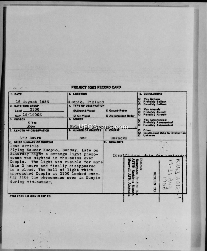 PROJECT 10073 RECORD CARD - Kuopio, Finland - 19 August 1956