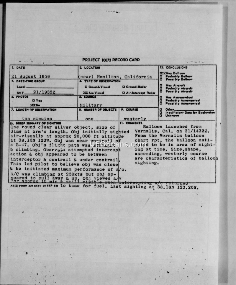 Project 10073 Record Card and Joint Messageform — Hamilton, California, 21 August 1956