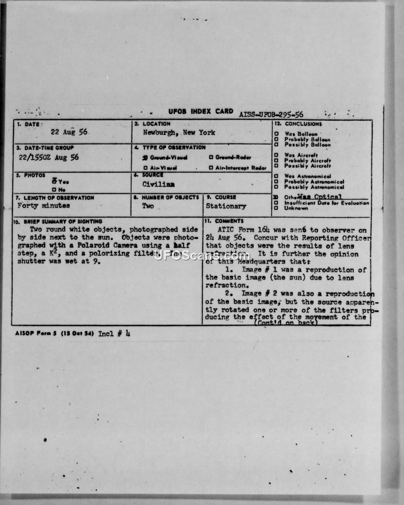 On August 22, 1956, an unidentified aerial phenomenon was reported in Newburgh, New York, by a civilian witness. The witness, while in their backyard at approximately 11:40 A.M. on a clear, bright day, attempted to photograph the sun using a Polaroid camera equipped with three filters: a half-step, a K2, and a polarizing filter. Upon developing the photographs, the witness observed two round, white objects positioned side-by-side next to the sun, which appeared to be of the same magnitude as the sun. The witness took four photographs in total between 11:40 A.M. and 1:30 P.M. and noted that the objects appeared to change position and move closer together in the second photograph. The witness contacted Stewart Field Air Force Base to inquire about weather balloons but was informed none had been launched. The witness subsequently provided the photographs and information to Lt. O'Day of the intelligence department. The 4602D Air Intelligence Service Squadron (ADC) investigated the incident and forwarded the materials to the Air Technical Intelligence Center (ATIC). The official evaluation concluded that the objects were not physical entities but rather optical artifacts resulting from lens refraction. Headquarters personnel determined that the images were reproductions of the sun caused by the camera's filter setup. Specifically, it was noted that the apparent movement of the objects in the second photograph was likely caused by the witness rotating one or more of the filters during the photographic process. Furthermore, it was observed that images #3 and #4 were taken with a different filter configuration, as evidenced by the contrast between the clouds and the sun in those frames compared to the lack of clouds in the first two images. The case was closed with the evaluation that the sighting was optical in nature.
