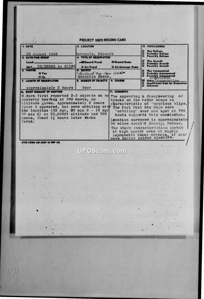 Project 10073 Record Card: Bornholm, Denmark Sighting, 22 August 1956
