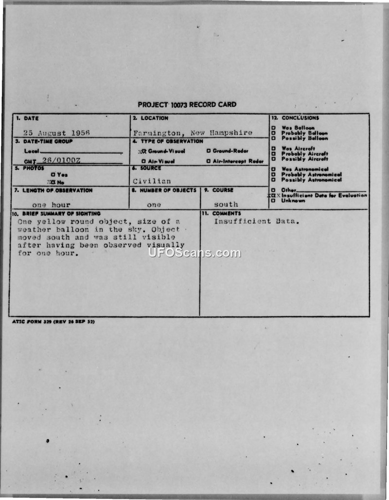 A 1956 sighting report from Farmington, New Hampshire, describes a yellow, round object observed for one hour. The military investigation concluded there was insufficient data to identify the object.