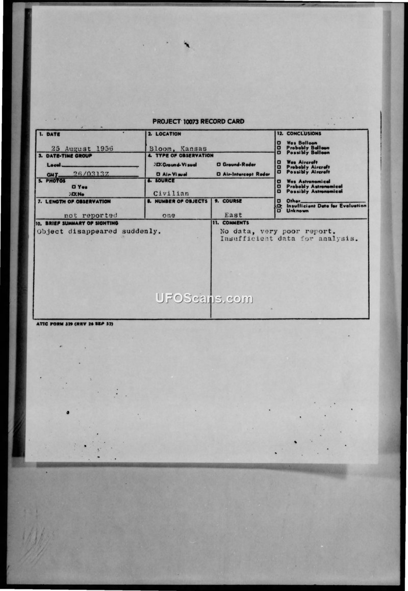 A civilian in Bloom, Kansas, reported a single unidentified object on 25 August 1956. The military investigation concluded the report was too poor to analyze.