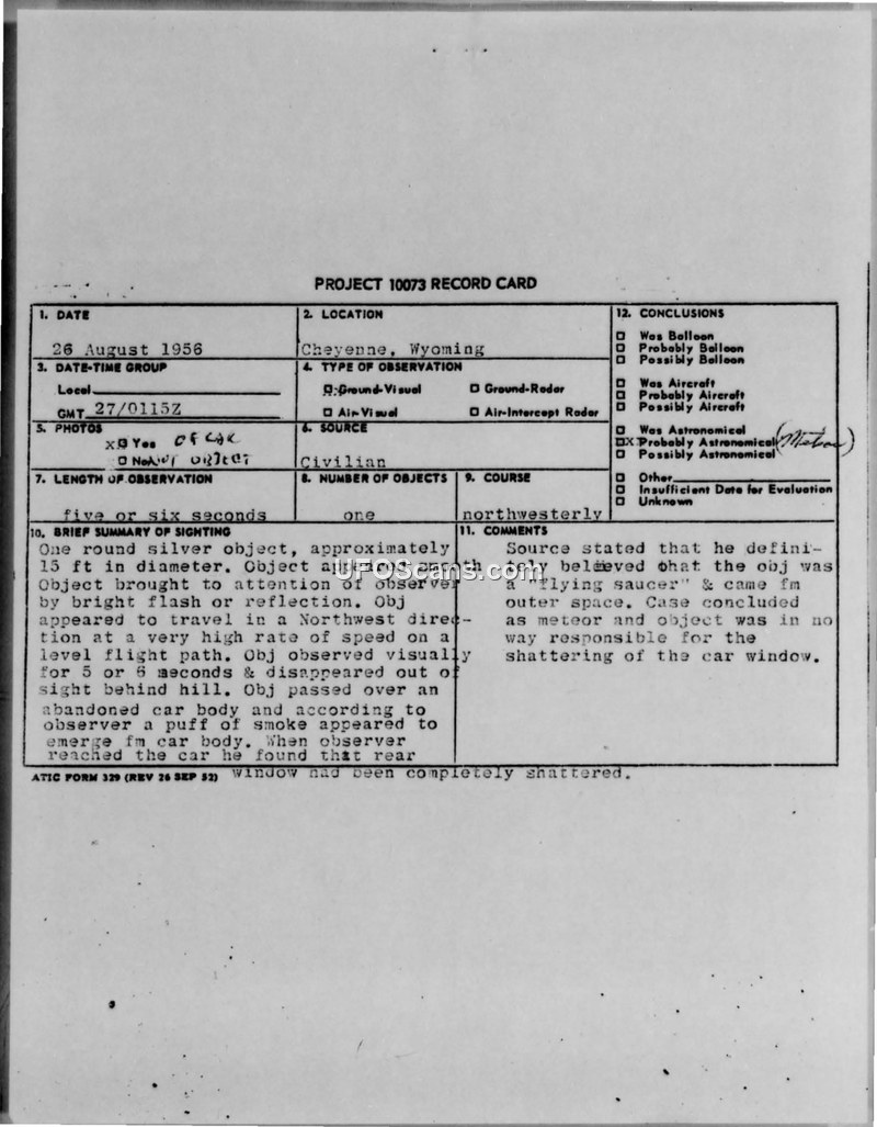 A 16-year-old witness reported a silver, round UFO near Cheyenne, Wyoming, on 26 August 1956. The investigation concluded the object was a meteor and unrelated to the simultaneous shattering of a nearby car window.