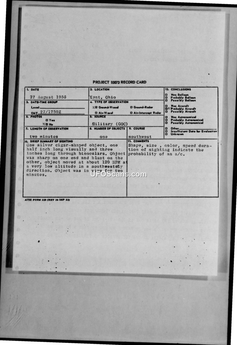 On August 27, 1956, at 1750Z, a sighting of an unidentified aerial object occurred in Kent, Ohio. The witness, 14-year-old Terry Beal, observed a single silver, cigar-shaped object for a duration of two minutes. The object was described as being sharp on one end and blunt on the other, with no sound reported. The witness observed the object visually and through 7x50 binoculars, estimating its size as half an inch long visually and three inches long through the binoculars. The object was moving in a southwesterly direction at a speed of approximately 120 MPH at a very low altitude. The report was processed by the 662nd ACWRON at Brookfield AFSTA, Ohio, and documented on a Project 10073 record card. Intelligence Officer Geprge Wagasky Jr. noted that the characteristics of the object—specifically its shape, size, color, and speed—suggested the probability that the object was an aircraft. Weather conditions at the time were reported as scattered. The report was transmitted via teletype to various Air Force commands, including the Air Defense Command at Ent AFB, Colorado, and the Director of Intelligence at HQ USAF in Washington, D.C.