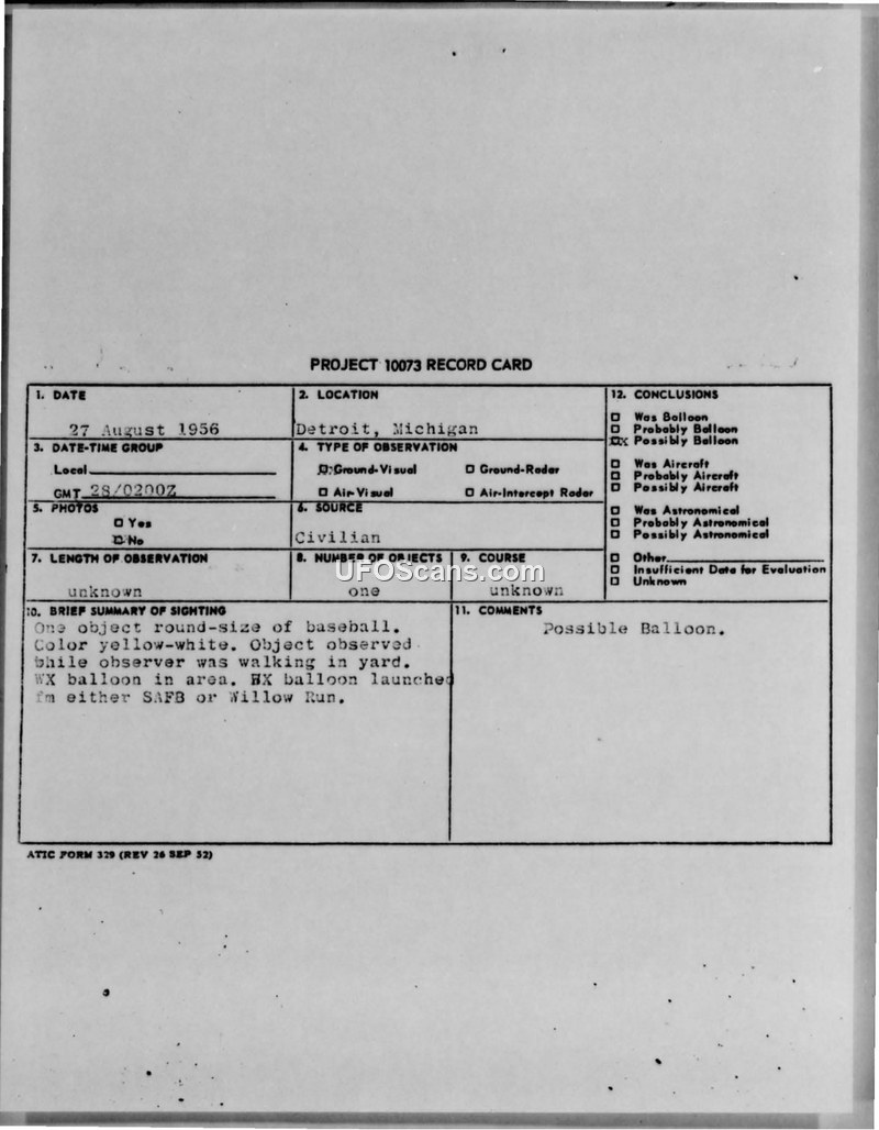 Project 10073 Record Card — Detroit, Michigan, 27 August 1956
