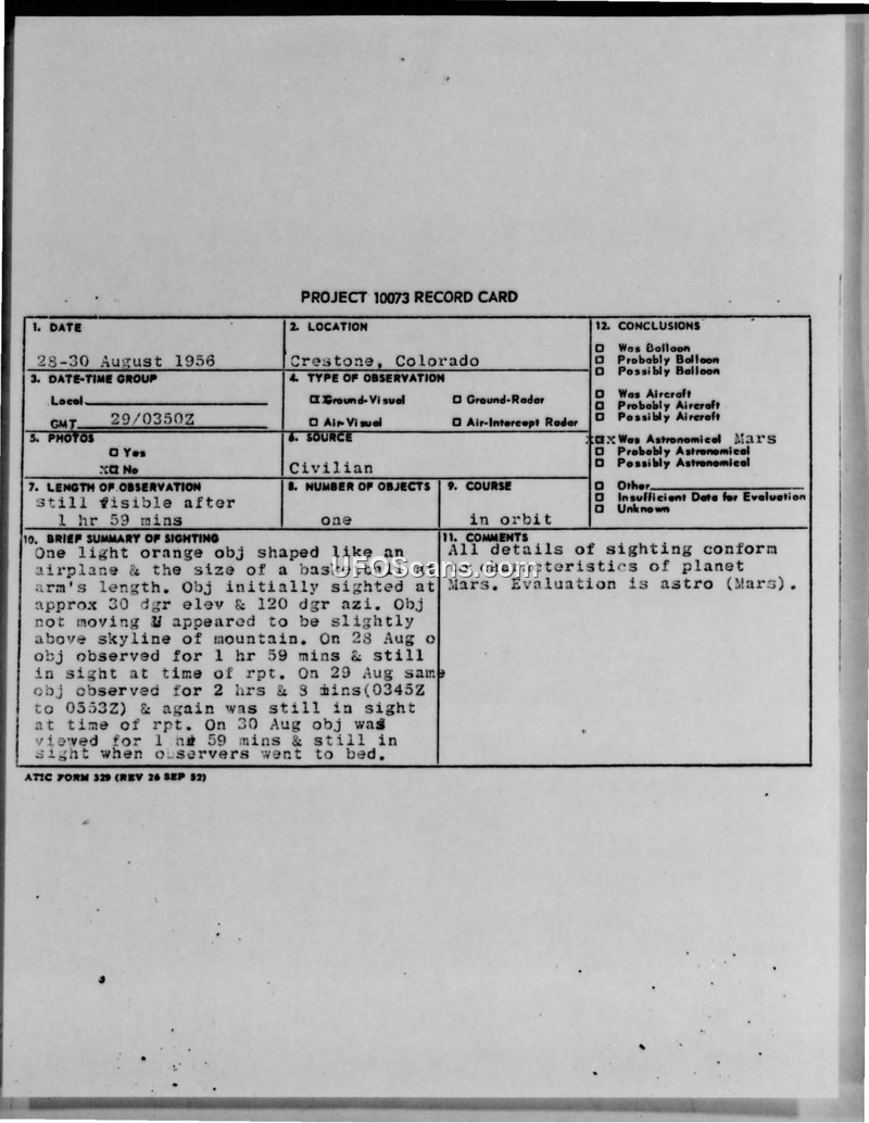 This document is a Project 10073 record card detailing a series of sightings reported by civilians in Crestone, Colorado, between August 28 and August 30, 1956. The observers described a single, light orange object that appeared to be the size of a basketball when held at arm's length. The object was noted to be stationary, positioned slightly above the mountain skyline at an elevation of approximately 30 degrees and an azimuth of 120 degrees. The sightings occurred over three consecutive days, with durations of approximately two hours each. The report explicitly states that no photographs were taken and there was no radar contact. The official evaluation concluded that the observed object was the planet Mars, noting that the sighting details conformed to the characteristics of that planet.