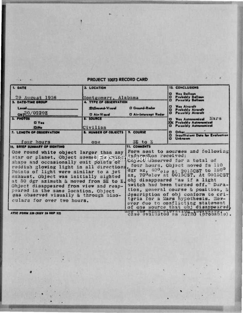 Project 10073 Record Card: Sighting Report - Montgomery, Alabama, 29 August 1956