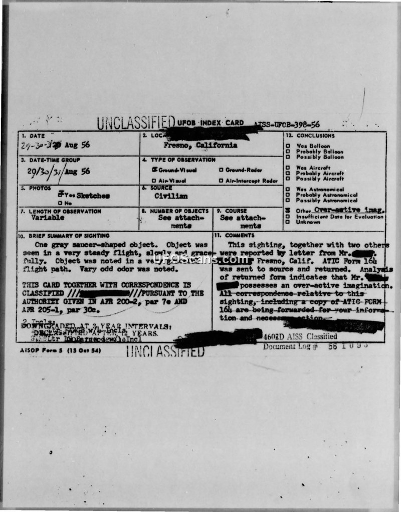 A civilian in Fresno, California, reported multiple UFO sightings in August and September 1956, describing a solid, saucer-shaped object with an associated odor. The Air Force officially dismissed the reports, attributing them to the witness's over-active imagination.