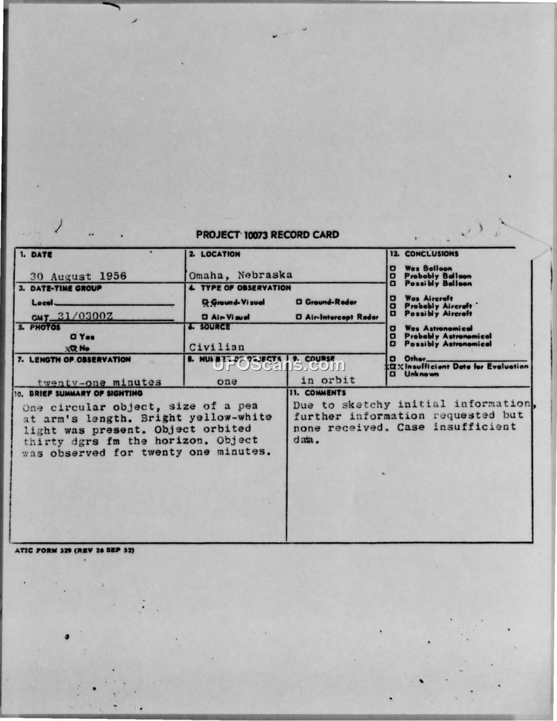 Project 10073 Record Card — Omaha, Nebraska, 30 August 1956