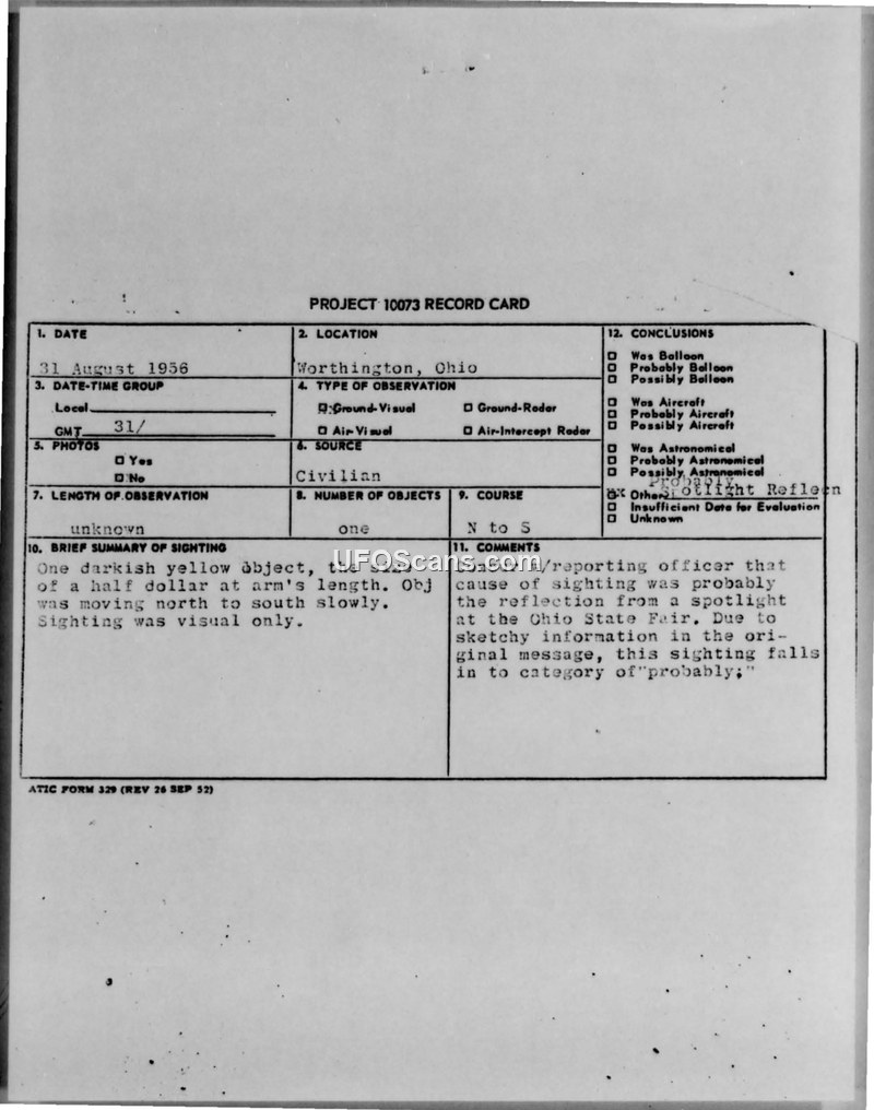 This document is a compilation of various UFO sighting reports and administrative records from August 1956, maintained under Project 10073. The collection includes a formal record card for a sighting in Worthington, Ohio, on August 31, 1956, which was officially attributed to a spotlight reflection from the Ohio State Fair. The document also contains several 'Information Only' case summaries detailing various civilian and military observations throughout August 1956. These include reports from Tiburon, California, where a witness observed objects he initially thought were birds but later speculated were 'flying saucers' due to their estimated speed; a report from the Canadian Rockies involving an RCAF jet pilot who photographed an object; and sightings in Fairhaven, Massachusetts, Eureka, California, Williamstown, Kentucky, Cincinnati, Ohio, and London, England. Additionally, the document includes a summary table of sightings from September 1-12, 1956, categorizing them by date, location, observer type, and evaluation (e.g., Balloon, Aircraft, Astro, Unidentified). A specific correspondence from a witness to Dr. Hynek is included, detailing a sighting from August 20, 1956, where the witness observed a large, blunt-shaped object with a dome-like structure that appeared to 'park' in the sky before accelerating rapidly. The document reflects the military's systematic approach to collecting, categorizing, and evaluating these reports, often dismissing them as astronomical phenomena, aircraft, or reflections, while maintaining records for those that remained unidentified or required further investigation.